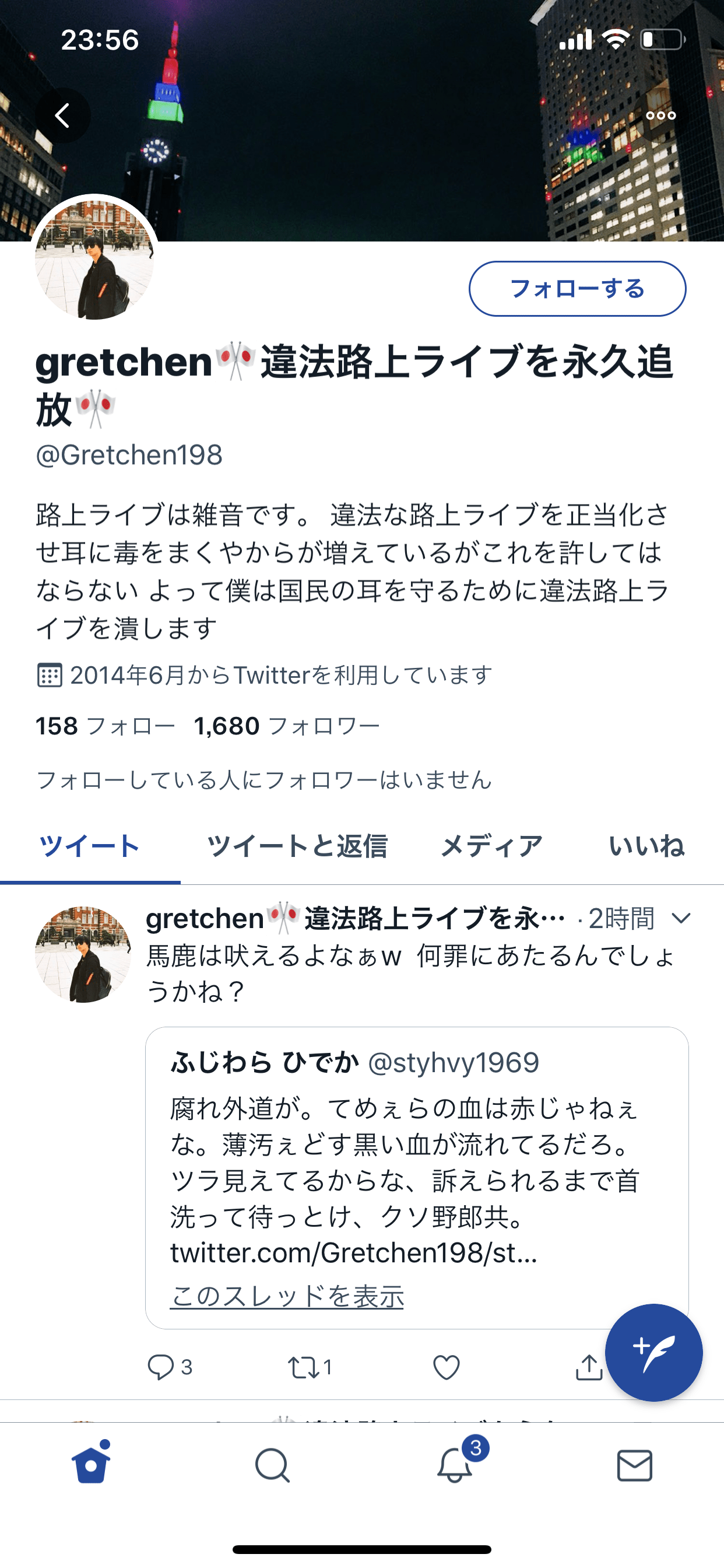 趣味で路上ライブ潰しやってるワイに質問ある?www 2020年11月30日 カテゴリ:ニュース・雑談 1: 2020/11/30(月) 04:09:18.04 ID:1hjduvm30 路上ライブしてるゴミを警察に通報して追い払って貰ってるで まだ11回くらいしか成功してないが 【趣味で路上ライブ潰しやってるワイに質問ある?www】の続きを読む タグ :#路上ライブ#騒音#迷惑#通報#警察